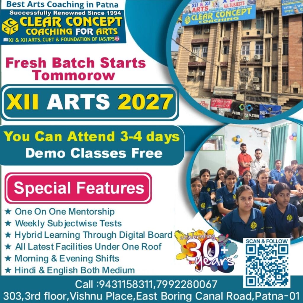 Choosing the right coaching institute plays a crucial role in building a strong academic foundation, especially for students preparing for Class 12 Arts. If you are searching for the best arts coaching in Patna, Clear Concept brings an excellent opportunity for students of XII Arts 2027 batch. A fresh batch is starting tomorrow, and students can attend 3–4 days of free demo classes to understand the teaching quality and learning environment before enrollment.