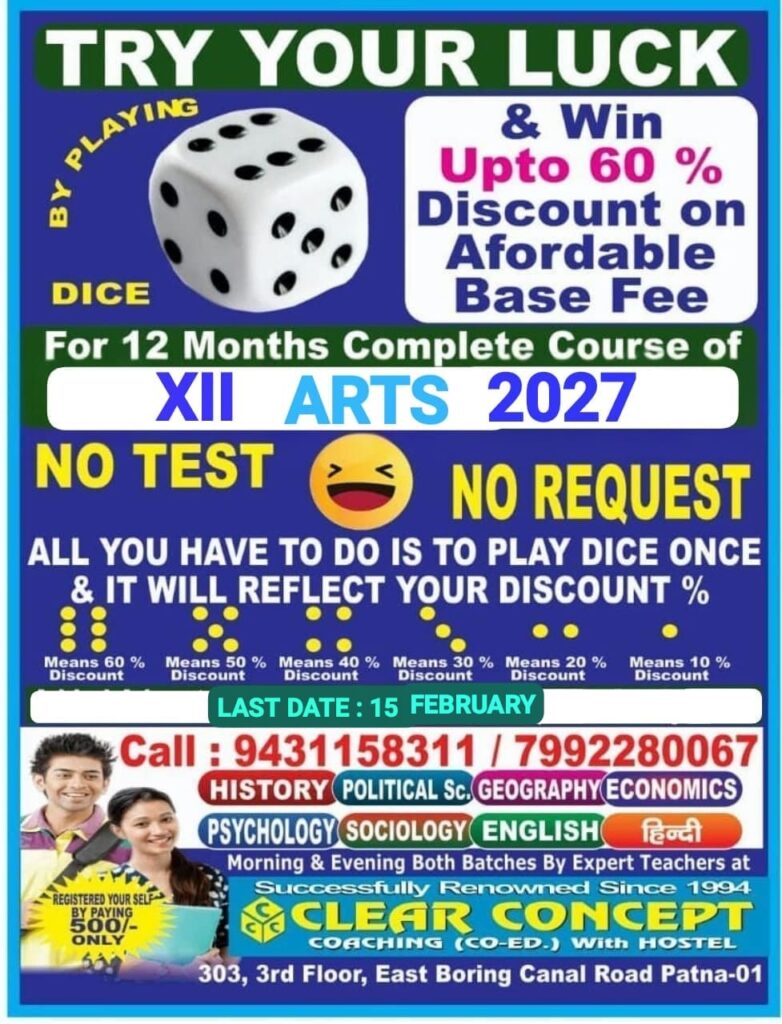 Clear Concept Best Arts Coaching in Patna has always believed in making quality education accessible and affordable for students. To encourage aspiring Class XII Arts students for the 2027 batch, Clear Concept proudly announces an exciting and transparent admission offer – “Try Your Luck and Win up to 60% Discount on Base Fees.”
