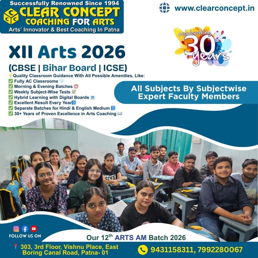 If you’re searching for the best Arts coaching in Patna for Class XII (2026) students, your search ends here! Clear Concept, Patna’s most trusted and result-oriented Arts coaching institute, has officially announced the opening of new batches for students of CBSE, ICSE, and Bihar Board.