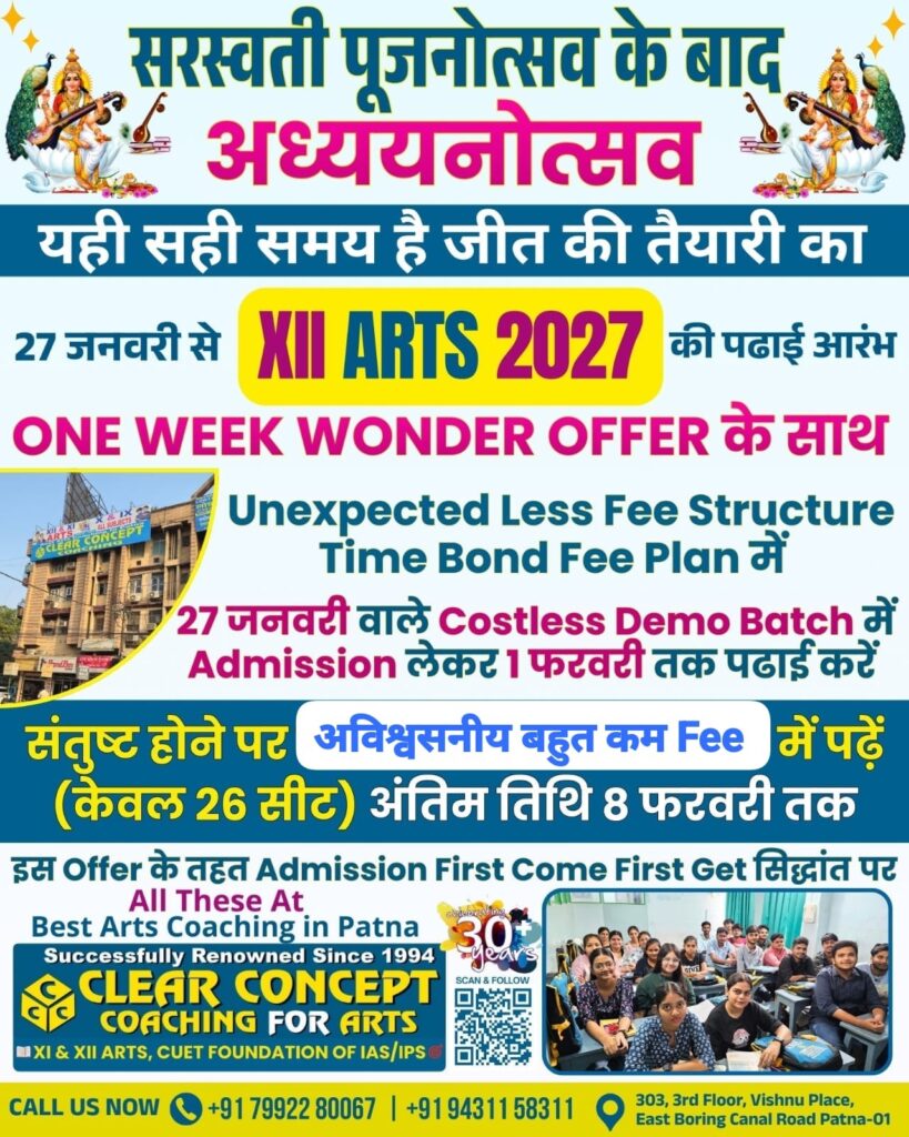 The right time to begin Class XII Arts 2027 Board preparation is now, and the right place is Clear Concept – Best Arts Coaching in Patna. We invite Arts students to join our All Subjects Costless Demo Classes starting from 27th January 2026, available in both OFFLINE classroom mode and ONLINE live classes.