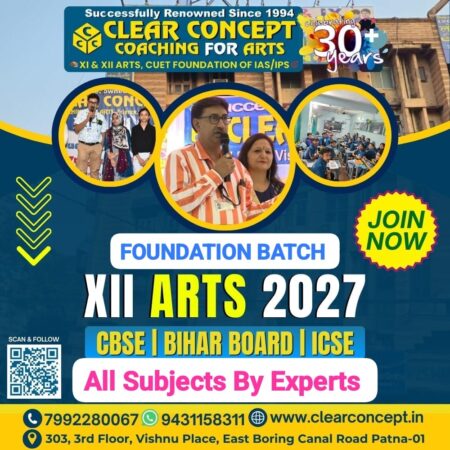 Welcome to our Foundation Course tailored specifically for 11th & 12th Arts students preparing for CBSE & BSEB board examinations! Clear Concept’s Foundation Course for 11th & 12th Arts offers a comprehensive and structured learning path designed to empower students with a deep understanding of core subjects spanning literature, history, political science, sociology, and fine arts. Tailored for CBSE & BSEB boards, this 16 to 20-month program integrates experienced faculty guidance, personalized attention, and rigorous assessments to ensure students develop a solid foundation, preparing them for academic excellence and success in their board examinations.