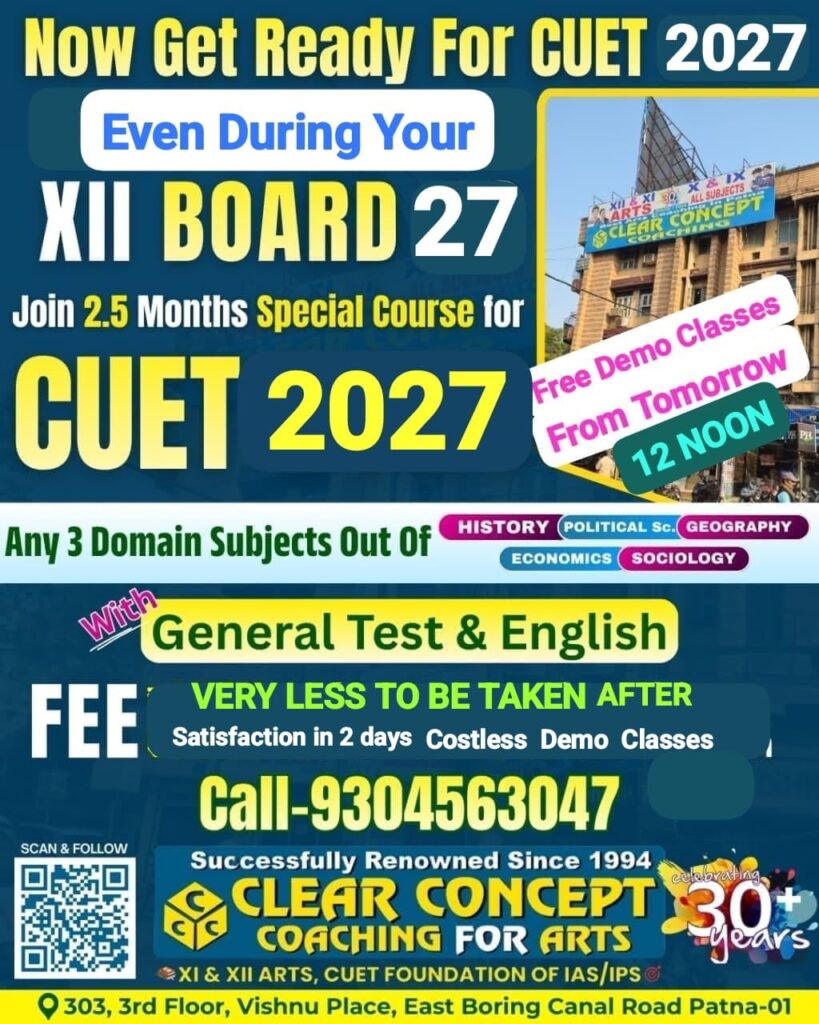 Students preparing for Class XII often worry about how they will manage entrance exam preparation along with their board exams. To solve this challenge, Clear Concept Coaching in Patna has introduced a special 2.5-month CUET 2027 preparation course designed specifically for Arts students. This program allows students to prepare for the CUET 2027 exam while continuing their Class XII board preparation without stress.