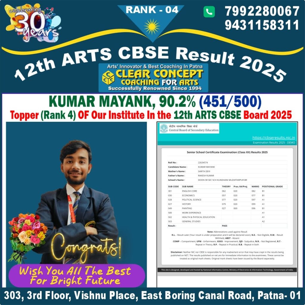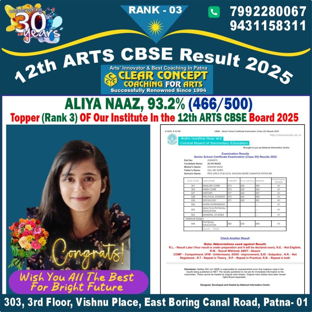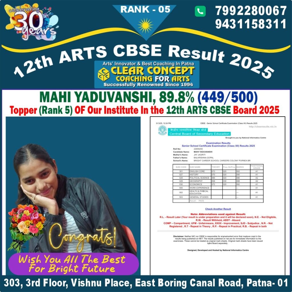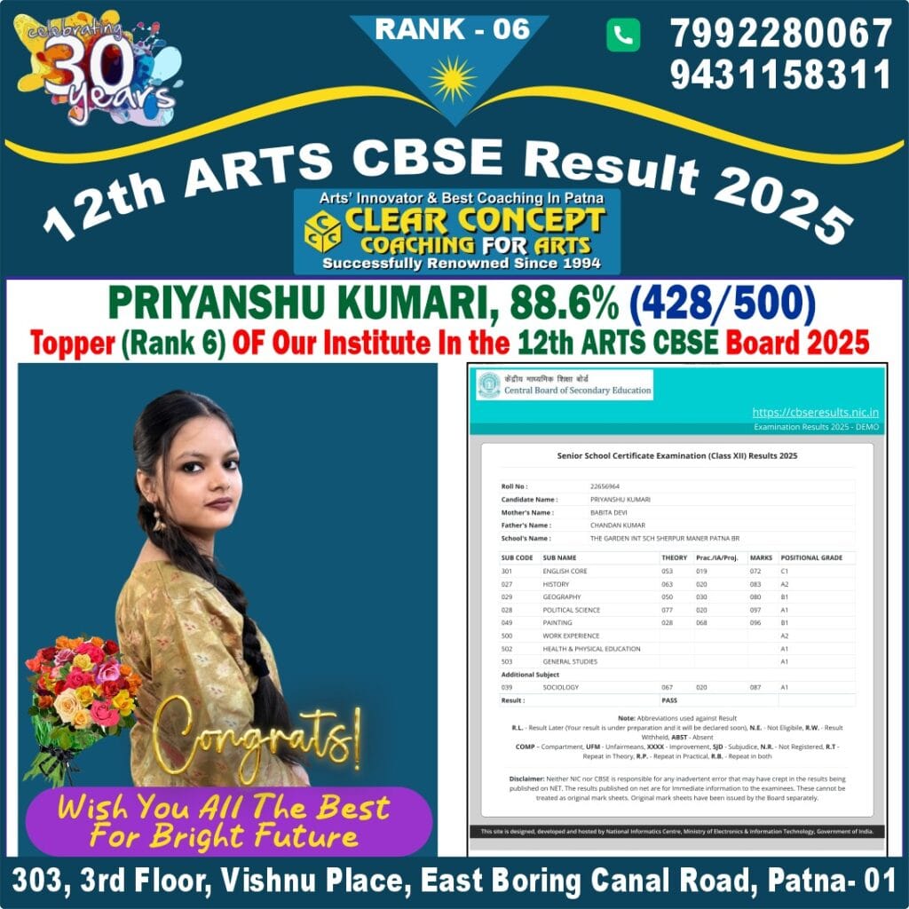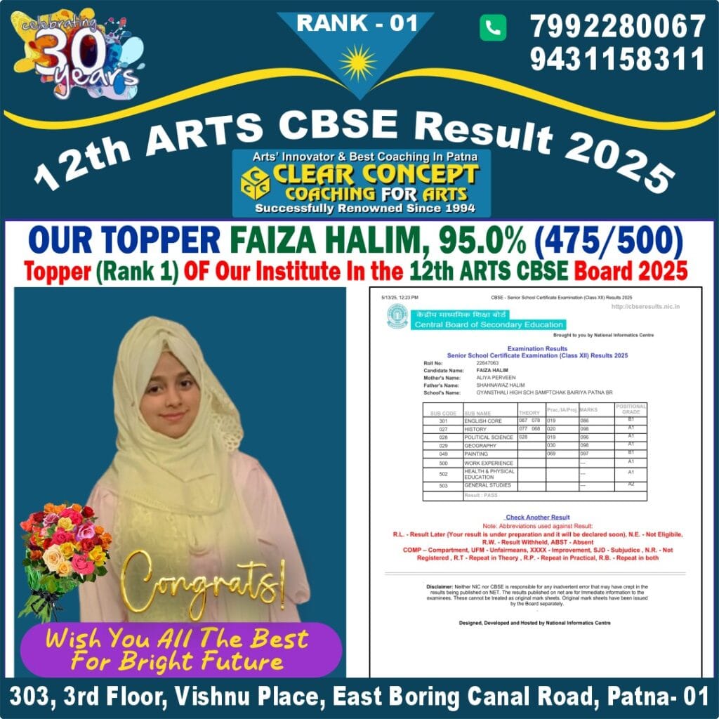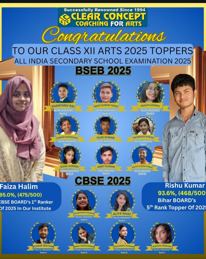 Our CBSE 12th Arts 2025 Toppers Our Bihar Board 12th Arts 2025 Toppers Our institute has been producing toppers since inception, here are some of our toppers:
