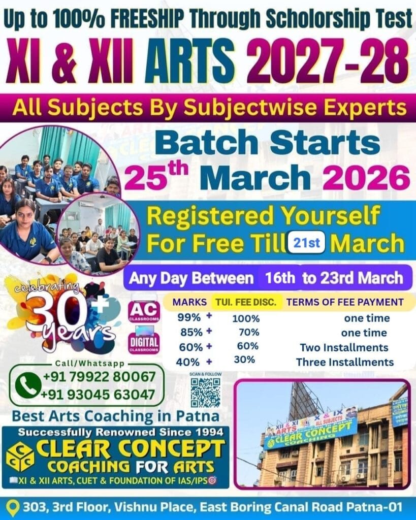 Students planning to pursue Arts in Classes XI and XII for the 2027–2028 academic session now have an excellent opportunity to study with expert teachers at a highly discounted fee. Clear Concept, known as one of the best coaching institutes for Arts students in Patna, has announced a scholarship test that offers up to 100% freeship based on performance.