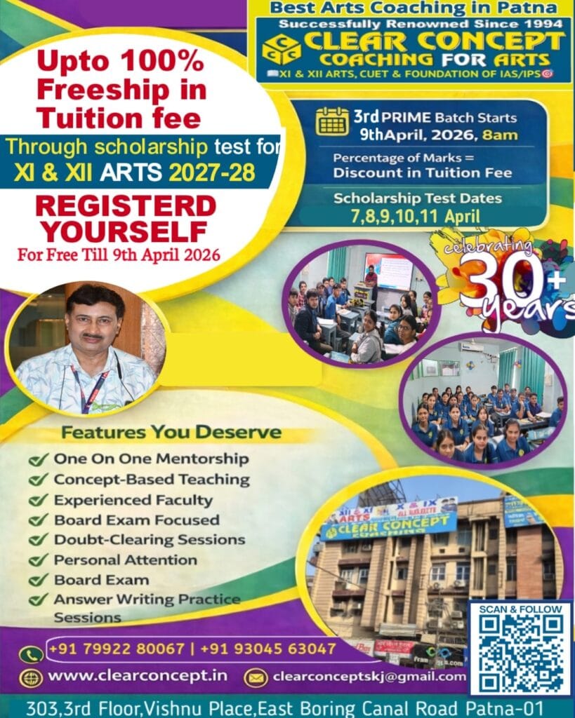 Students planning to pursue Arts in Class XI & XII (2027–2028) now have an excellent opportunity to reduce their tuition fee through a scholarship test at Clear Concept – Best Arts Coaching in Patna. The institute is offering up to 100% freeship in tuition fee, helping deserving students receive quality education at an affordable cost.